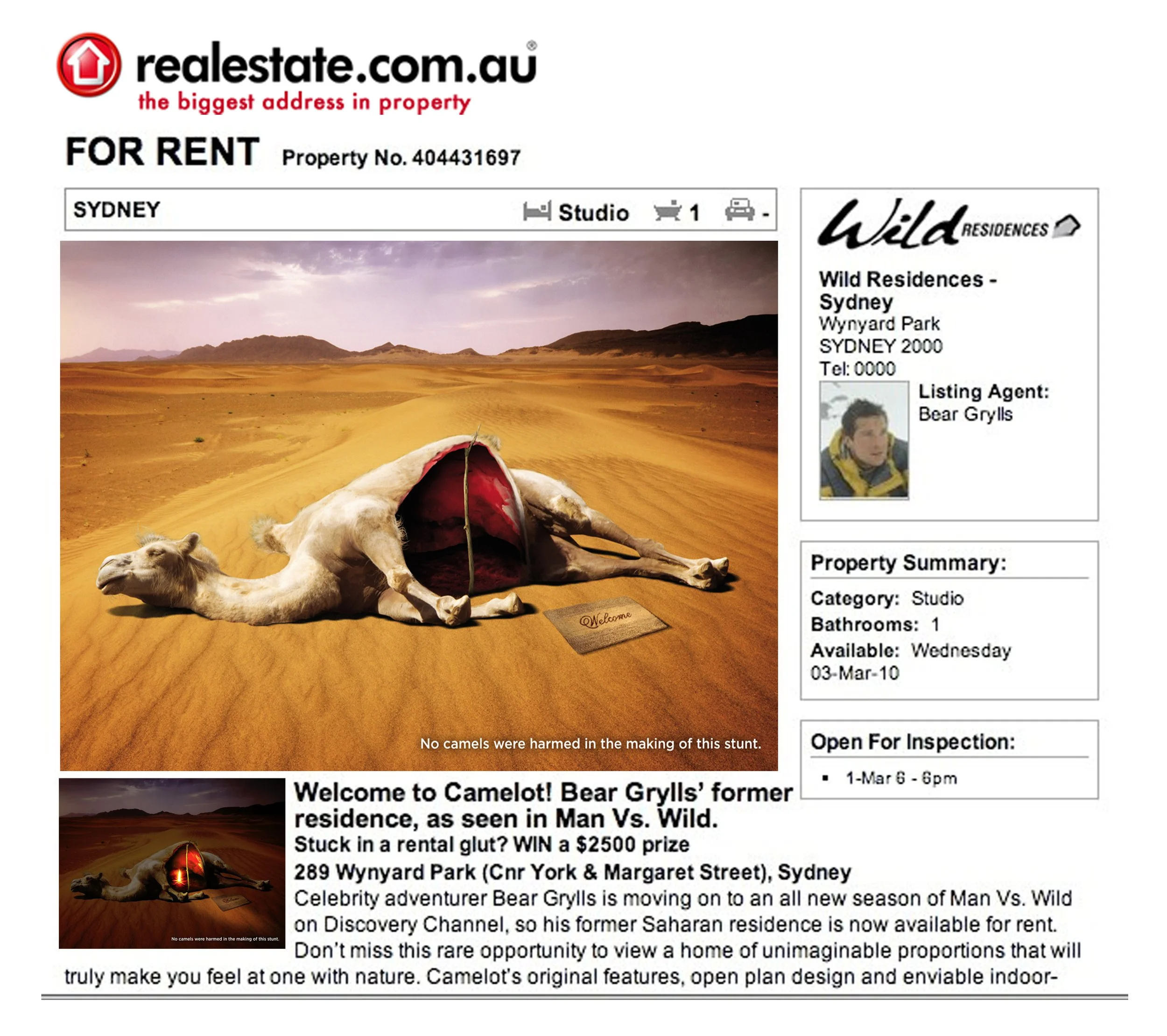 A unique property profile on realestate.com put the notorious camel carcass on the rental market.