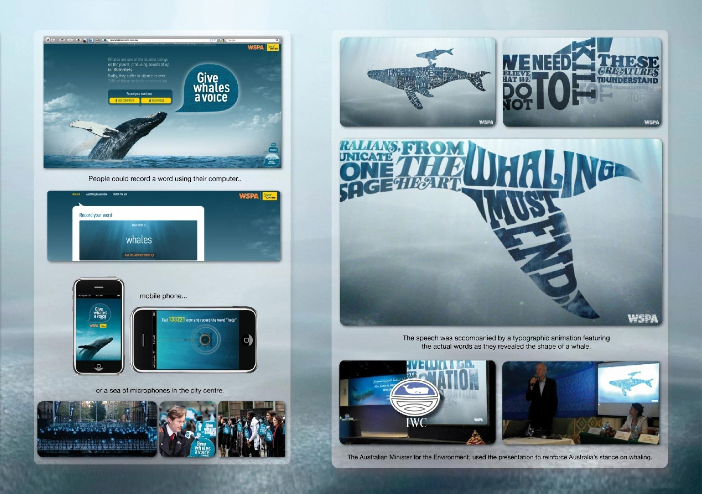 Whales are one of the loudest beings on theplanet, producing sounds of up to 188 decibels.Yet they suffer in silence as thousands are huntedeach year. To stop the slaughter, this campaignrallied Australians together to give whales a voice.All they had to do was record themselvessaying a single word using their mobile phoneor computer, then share their good deed onsocial media to encourage their friends to dothe same.